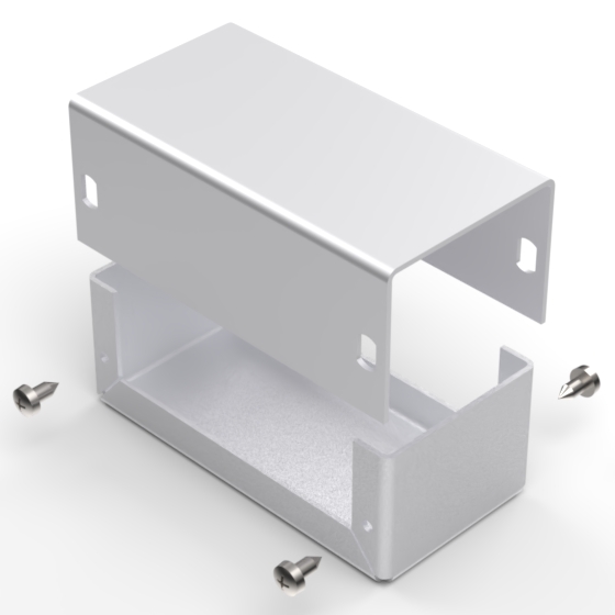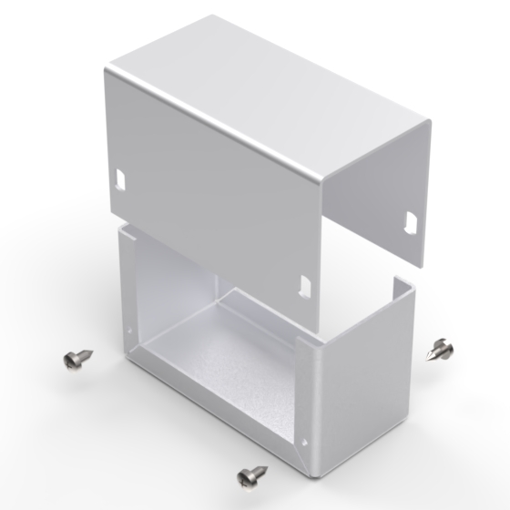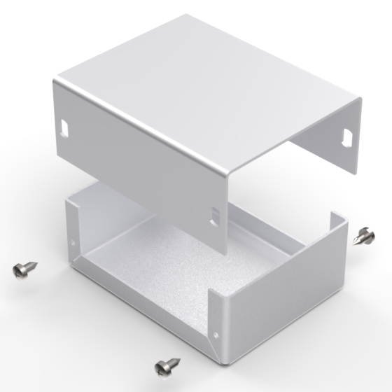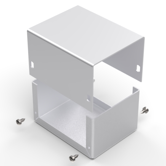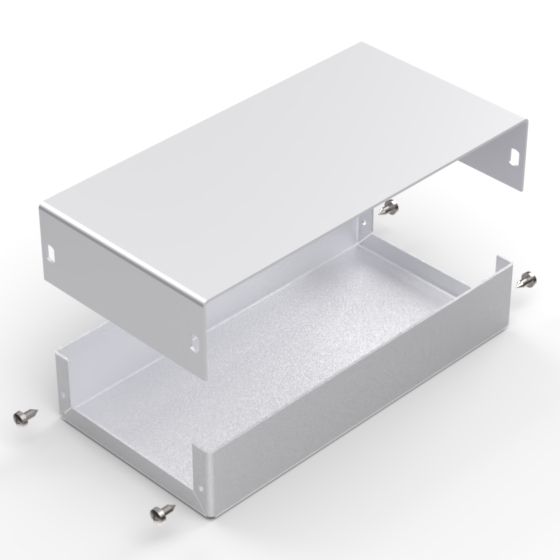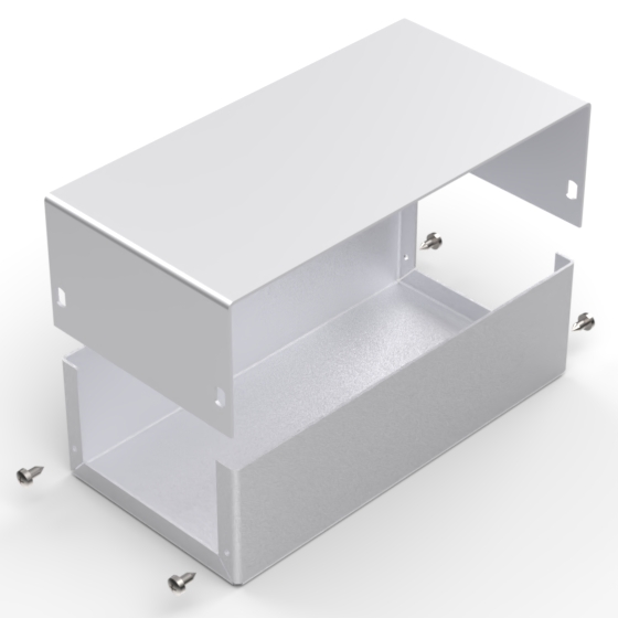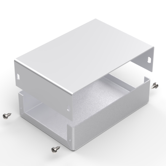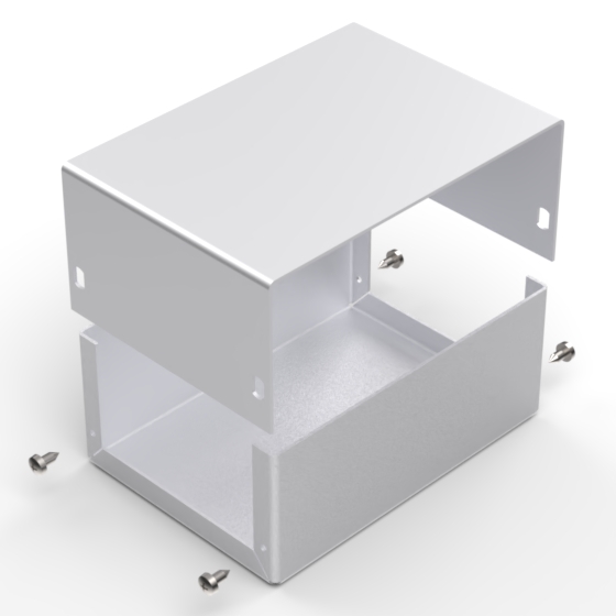Contenitori composti da fondo e coperchio in alluminio metallizzato di colore argento. Assemblaggio facile e veloce con chiusura a quattro viti.