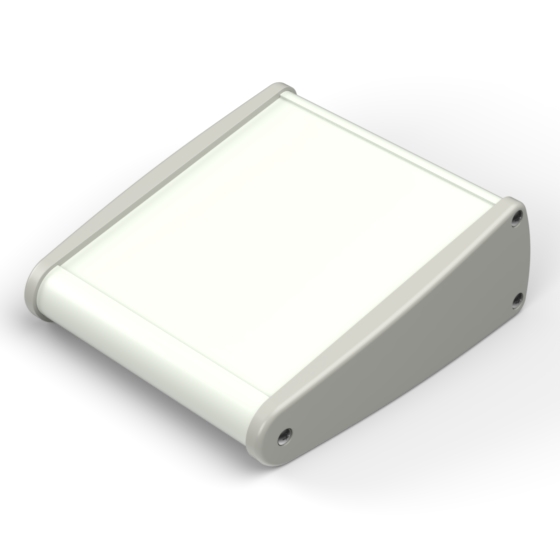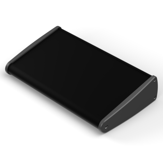 Contenitore in alluminio estruso inclinato con verniciatura esterna a polvere di elevato standard qualitativo. Due pannelli laterali in ABS, guide interne per PCB, parte superiore con area ribassata per l’alloggiamento di una tastiera a membrana. Chiusura a sei viti. Disponibili due combinazioni di colore: Nero RAL 9004/ Grigio scuro RAL 7012. Su richiesta, supporto per fissaggio a parete mod. “MT7.0”.