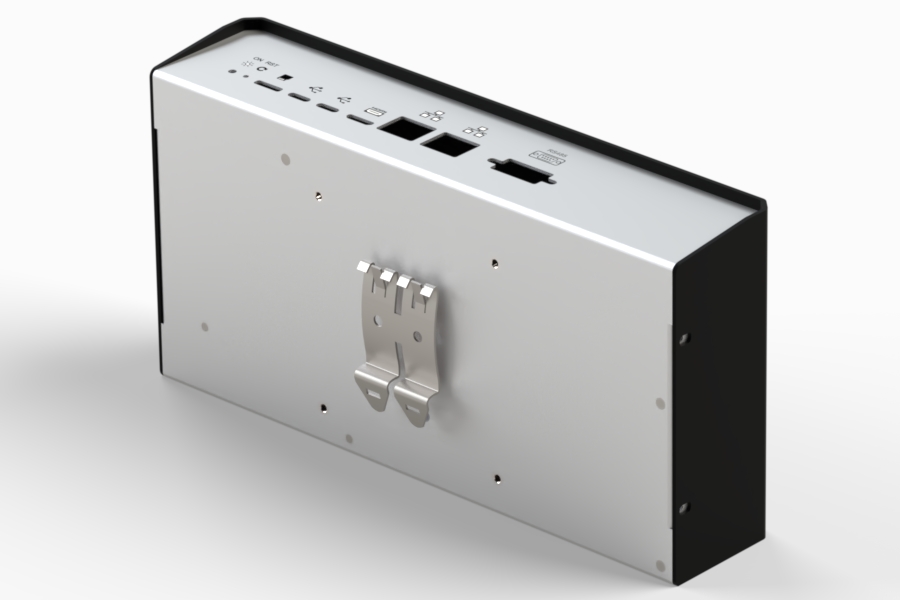 Aluminiumgehäuse mit silberfarbenen Unterteil und schwarzem Deckel. Einfache und schnelle Montage durch vier Schrauben.