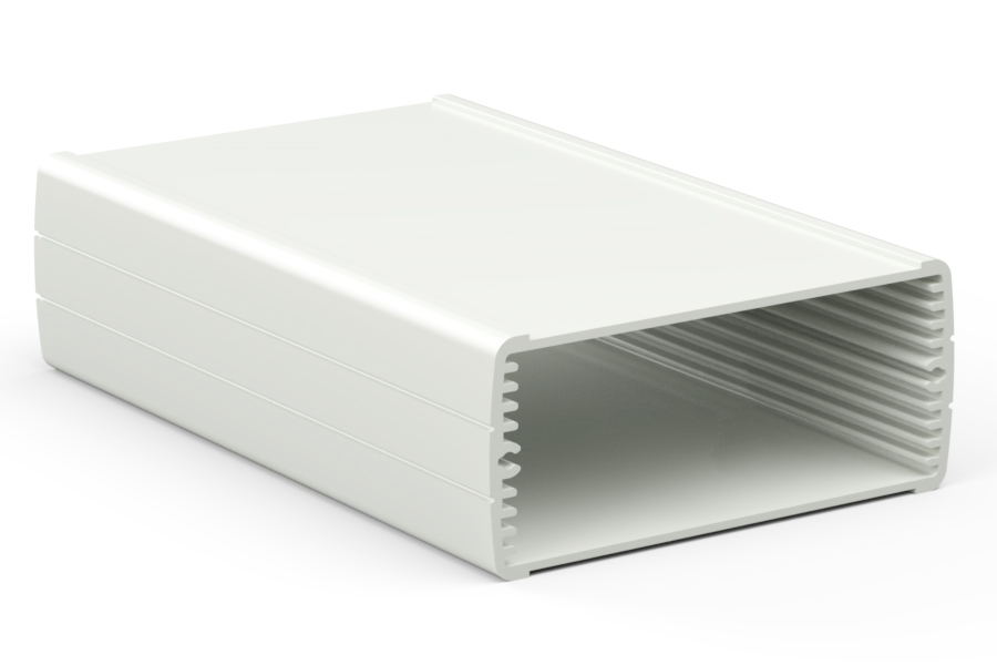 Profilgehäuse aus Aluminium mit qualitativ hochwertiger Oberflächelackierung. Zwei ABS-Abschlußdeckel, integrierte Führungsrippen für PCB und eingelassene Oberfläche zur Aufnahme einer Tastatur. Sechs Standardprofilvarianten mit verschiedenen Größen sind zur Verfügung. Die Modelle mit „-E“ haben Frontlaschen zur Wandmontage. Montage mit acht Schrauben.