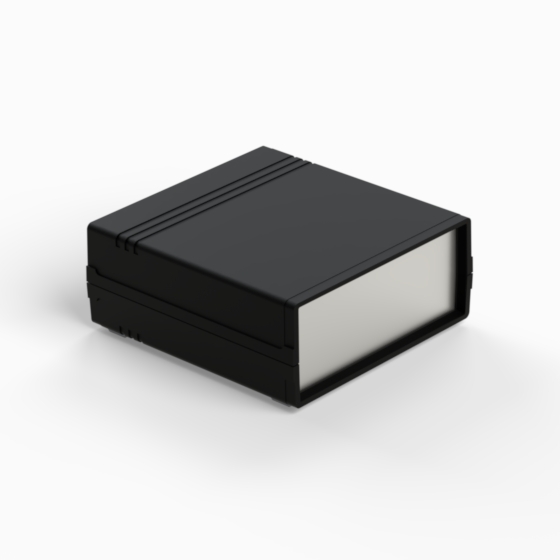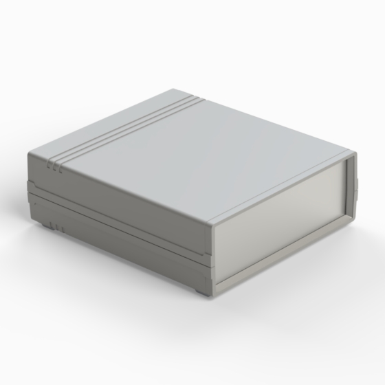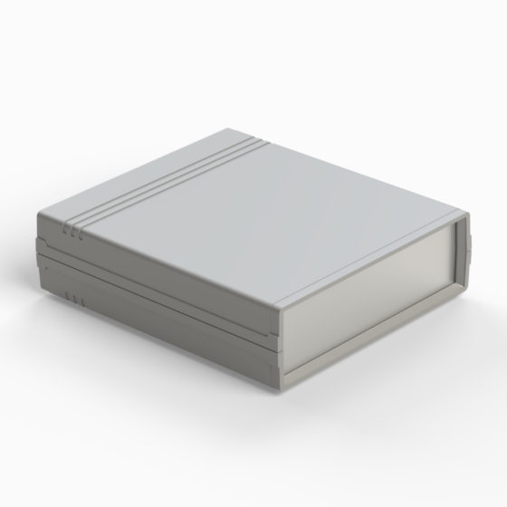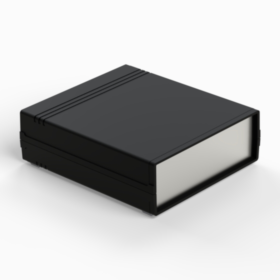 Kunststoffgehäuse mit zwei 1 mm starken Aluminiumdeckplatten. Jede Hälfte hat integrierte Führungen und Montagepfeiler für PCB. Matte Oberfläche. Montage mit nur 2 Schrauben. Front- und Rückplatte auch in hellgrauen ABS (Farbenkod .13) erhältlich. Version mit Plastikplatte: 011P, 012P, 022P, 222P, 223P, 233P.