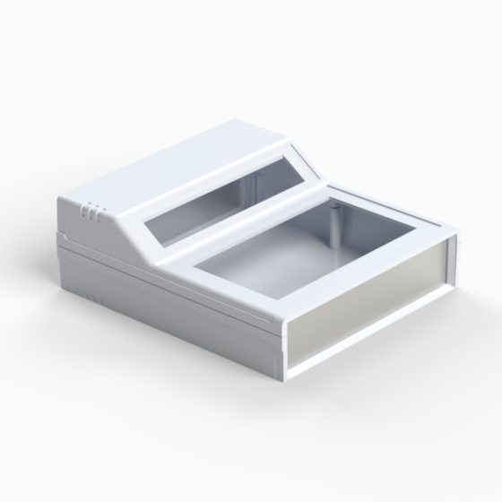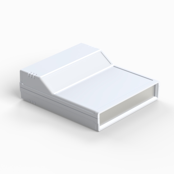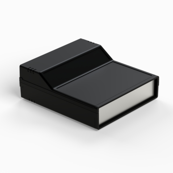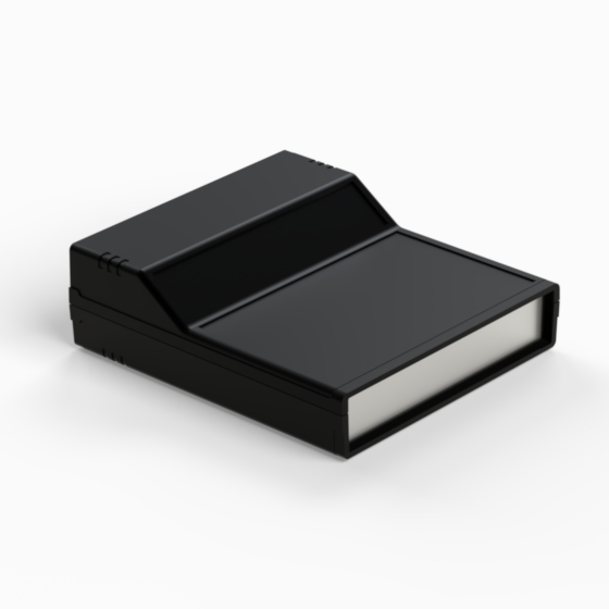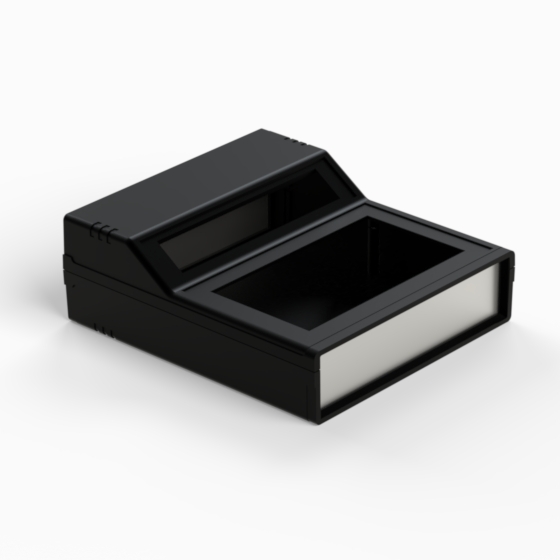 Kunststoffgehäuse mit zwei 1 mm starken Aluminiumdeckplatten. Jede Hälfte hat integrierte Führungen und Montagepfeiler für PCB. Matte Oberfläche. Die Modelle „242“ und „243“ haben ein um 45° geneigtes Anzeigefeld. Die Modelle „242/O“ und 243/O“ sind mit zwei Ausschnitten in den zurückgesetzten Flächen versehen. Montage mit nur zwei Schrauben. Nach Anfrage sind dunkelgraue ABS-Platte lieferbar (PP11, PP12, PP22, PP222, PP223, PP233), Zweifachclip für 9V-Batterie (AB9).