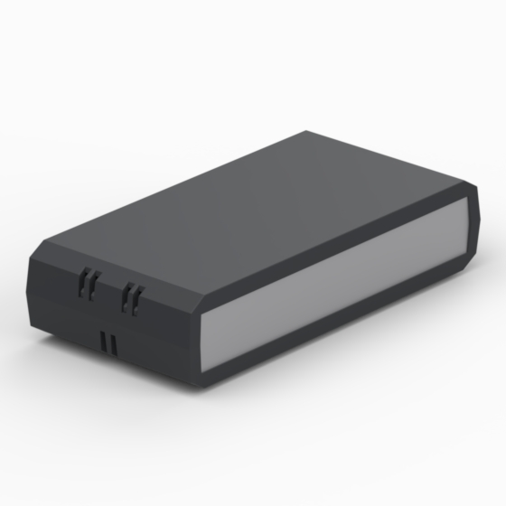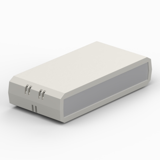 Kunststoffgehäuse mit Lüftungsschlitzen. Zwei 1 mm starken Aluminiumdeckplatten. Jede Hälfte hat integrierte Montagepfeiler für PCB. Matte Oberfläche. Schnappverschluß, keine Schrauben.