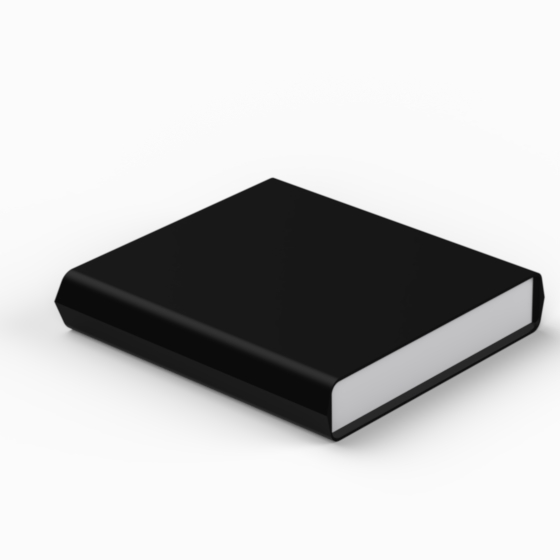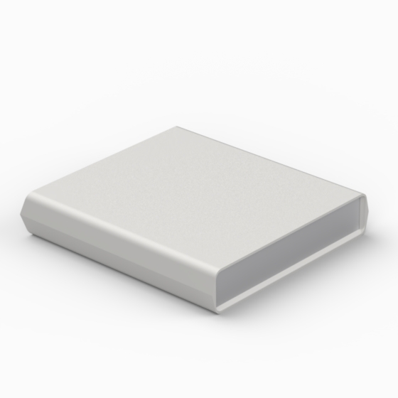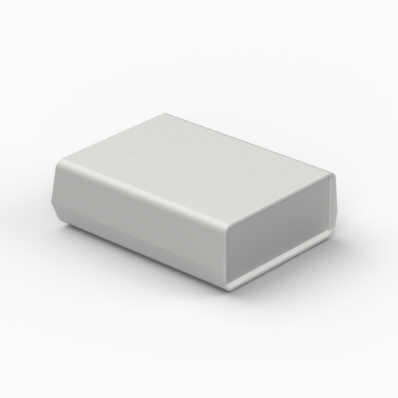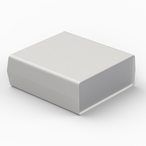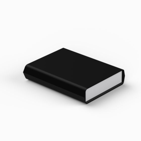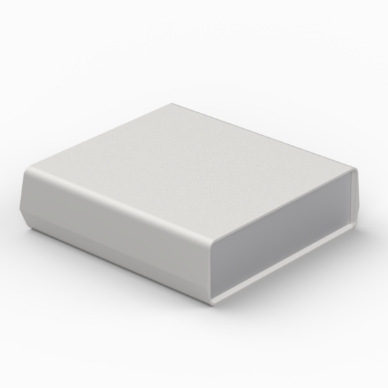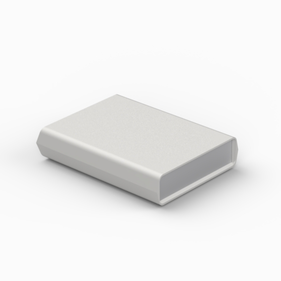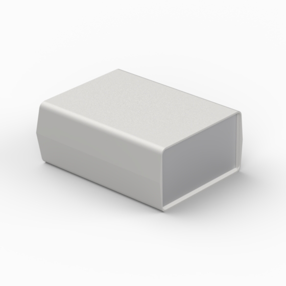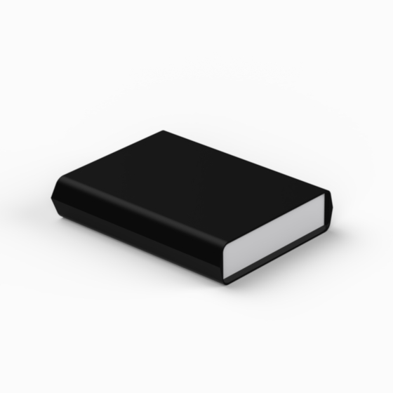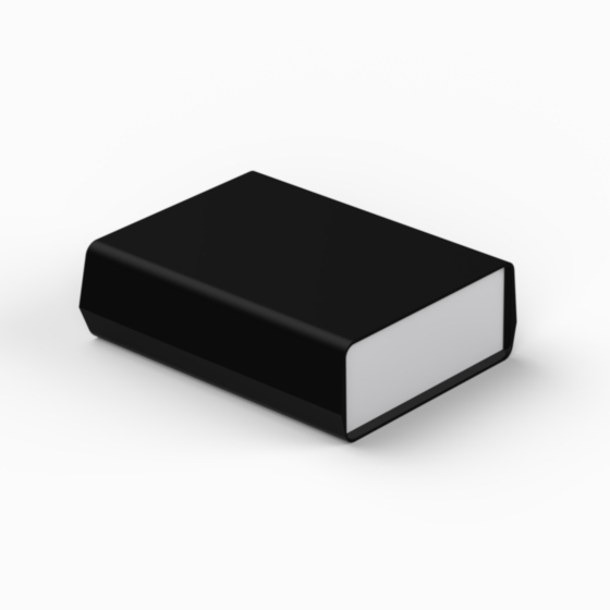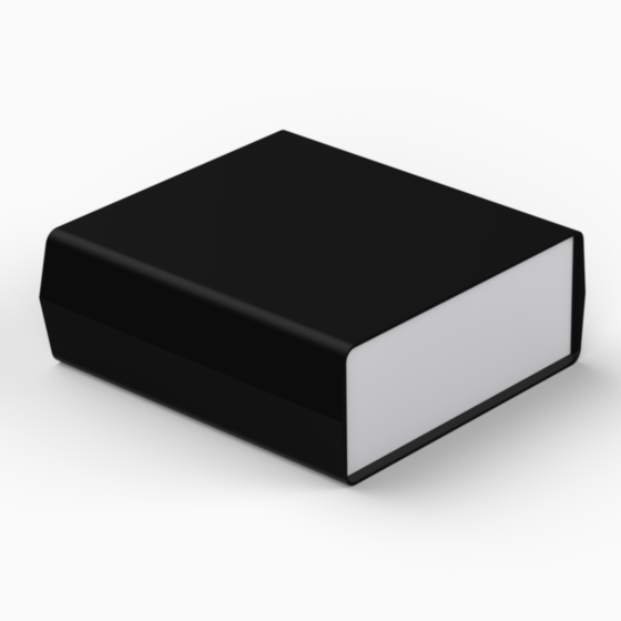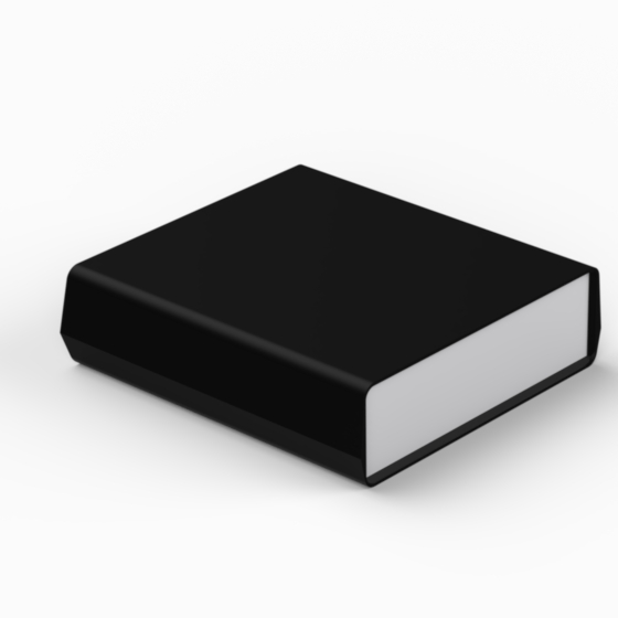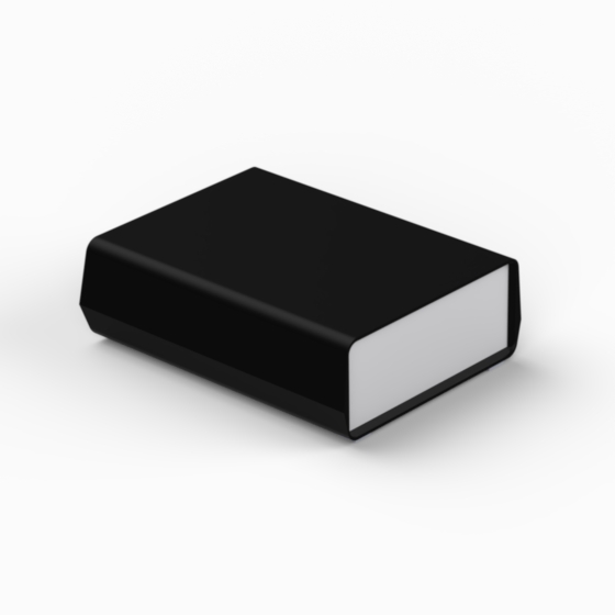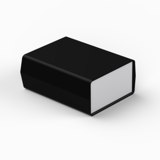 Kunststoffgehäuse mit zwei 1 mm starken Aluminiumabdeckplatten. Jede Hälfte besitzt integrierte Führungen und Montagepfeiler für PCB. Matte Oberfläche. Montage mit nur zwei Schrauben.