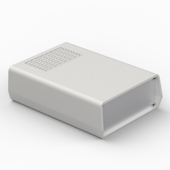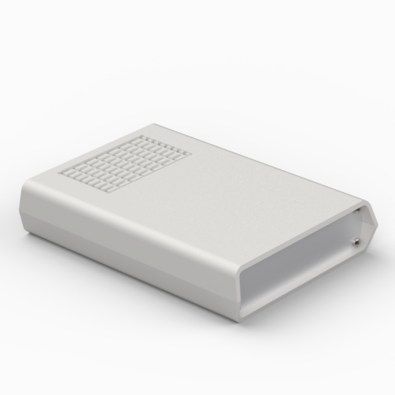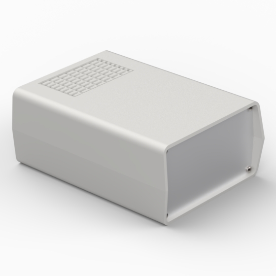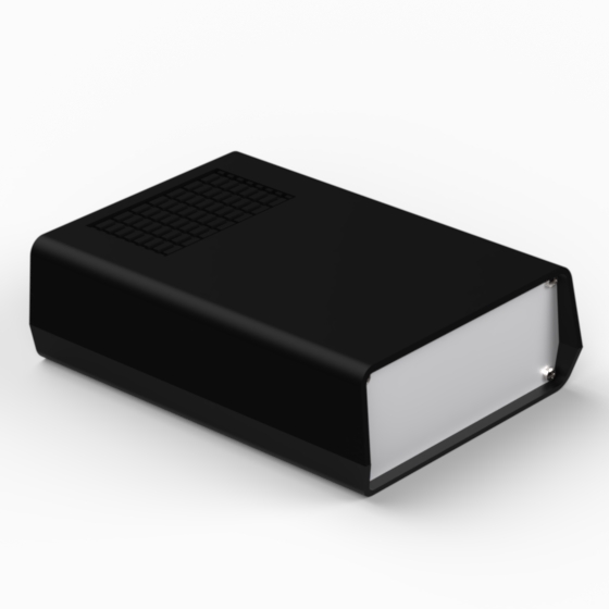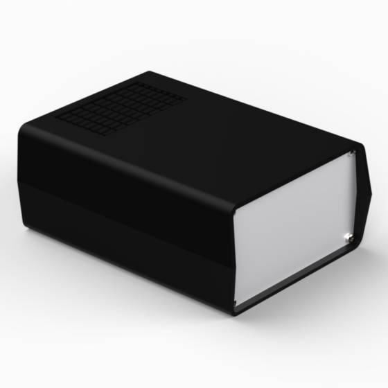 Kunststoffgehäuse mit Lüftungsschlitzen im Unterteil und im Deckel, Front-und Rückplatte aus 1 mm starken Aluminium. In beiden Hälften sind integrierte Führungen und Montagepfeiler für PCB integriert. Matte Oberfläche. Montage mit acht Schrauben.