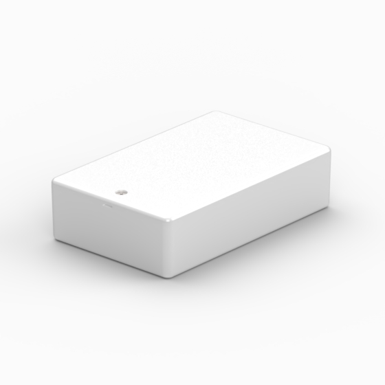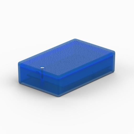 Kunststoffgehäuse mit abgerundeten Ecken und matter Oberfläche. Unterteil und Deckel haben Montagepfeiler für PCB. Zwei Farben möglich: Weiß und Transparent Blau. Verschluß durch eine Schraube.