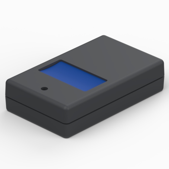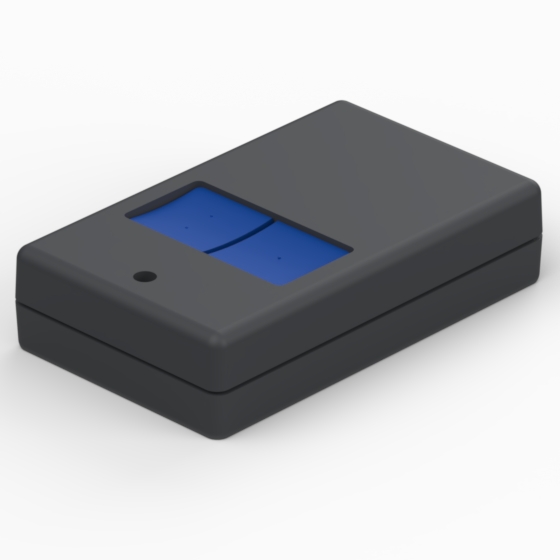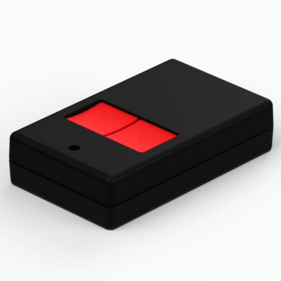 Kunststoffgehäuse mit abgerundeten Ecken und mit eins oder zwei Drucktasten. Der Gehäuseunterteil hat integrierten Montagepfeiler für PCB. Das Gehäuse hat zwei Metallkontakte für 12V-Batterien (Mod. AB12). Matte Oberfläche. Montage mit nur einer Schraube.