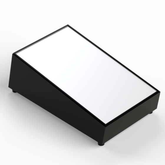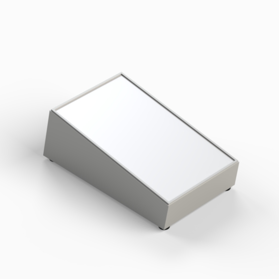 Scharfkantiges Kunststoffgehäuse mit 10° oder 12° Neigung zur leichten Handhabung bzw. Ablesbarkeit und 4 rutschfesten Füßen (Mod. PT/4). Innenwände des Unterteils mit integrierten Führungen für PCB. Zwei Aluminiumplatten, die mit 4 Schrauben montiert werden.